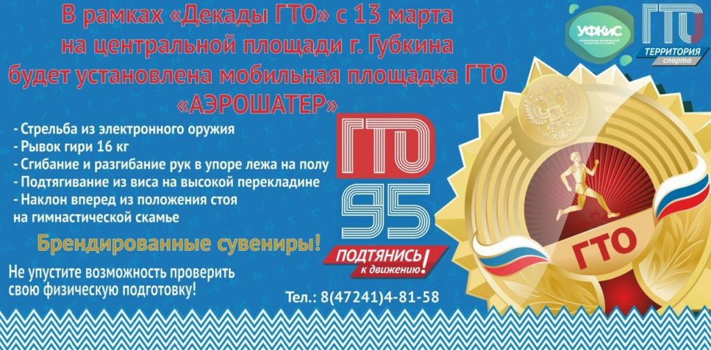С 13 марта на центральной площади г. Губкина Центр тестирования ГТО «ТЕРРИТОРИЯ СПОРТА» открывает двери мобильной площадки ГТО - аэрошатёр «ТЕРРИТОРИЯ СПОРТА», где каждый сможет проявить себя физически, ощутить радость движения и достижения новых целей!