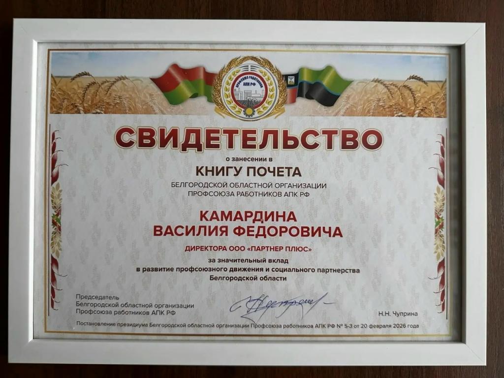 За значительный вклад в развитие профсоюзного движения и социального партнерства Белгородской области Камардин Василий Федорович, директор ООО «Партнер плюс», внесен в Книгу Почета Белгородской областной организации профсоюза работников АПК РФ и награжден нагрудным знаком ФНПР «За содружество».