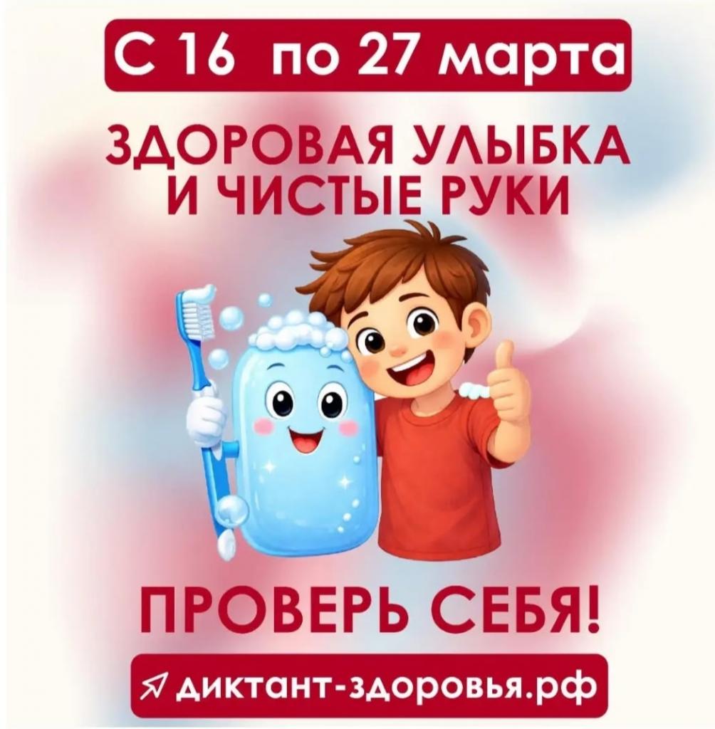 С 16 по 27 марта 2026 года стартует первый этап Всероссийской акции «Диктант здоровья»: проверяем знания о гигиене полости рта и чистых руках.