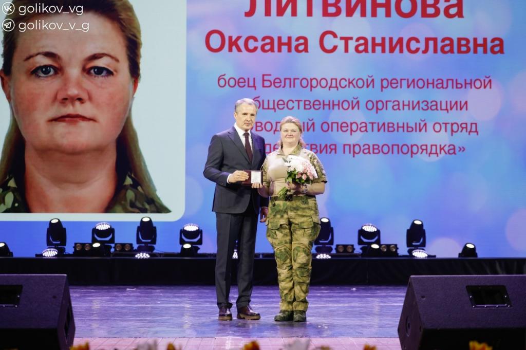 В преддверии Международного женского дня Губернатор Белгородской области Вячеслав Гладков вручил государственные, ведомственные и иные награды женщинам-бойцам Белгородской региональной общественной организации «Сводный оперативный отряд содействия правопорядка».